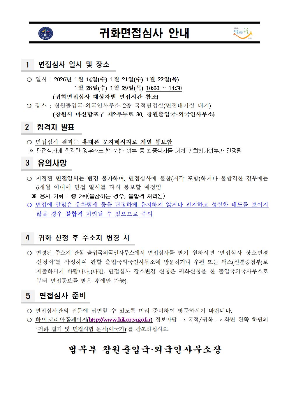 [창원] 2026년 1월 귀화면접심사 일정 및 대상자 알림